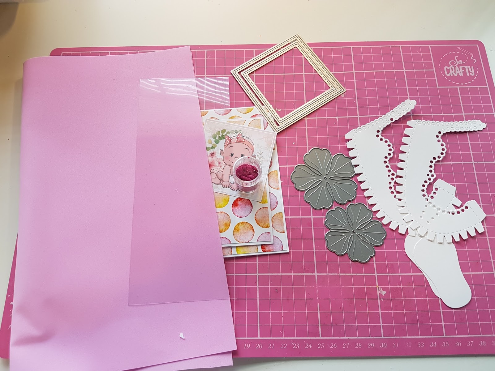 Wykorzystałam do mojej kartki kwadraciki z przeszyciami, digi stempelek od I love digi, buciki, cekiny i oczywiście folię do shaker boxa ( tzw. Acetate, nie wiem jak się ta folia nazywa po polsku 😂😂😂 i czy w ogóle ma jakąś nazwę ).